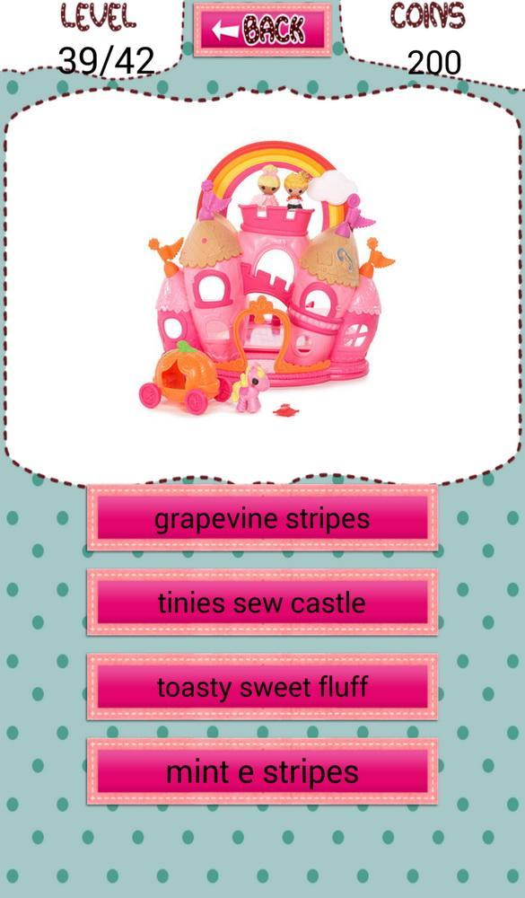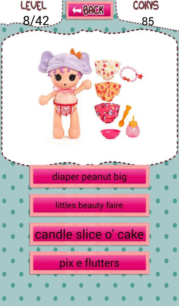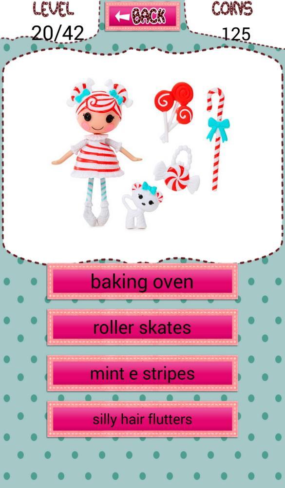Lalaloo Quiz Toys Game for Kids. Nama tebakan mainan yang terkenal dengan karakter kartun di Lalaloopsy. Pilih jawaban yang benar. Pengembangan otak dan mengembangkan keterampilan memori Anda, bersaing dengan teman dan keluarga Anda untuk mendapatkan lebih banyak poin. Nikmati secara gratis dan menyenangkan. Jika mainan Anda seperti Anda dan ingin mengalami mainan yang sebenarnya. Kami memiliki banyak mainan untuk lalaloopsy, silakan lihat produk aktual di situs belanja mainan atau toko mainan di dekat Anda dan menyenangkan untuk berbelanja.